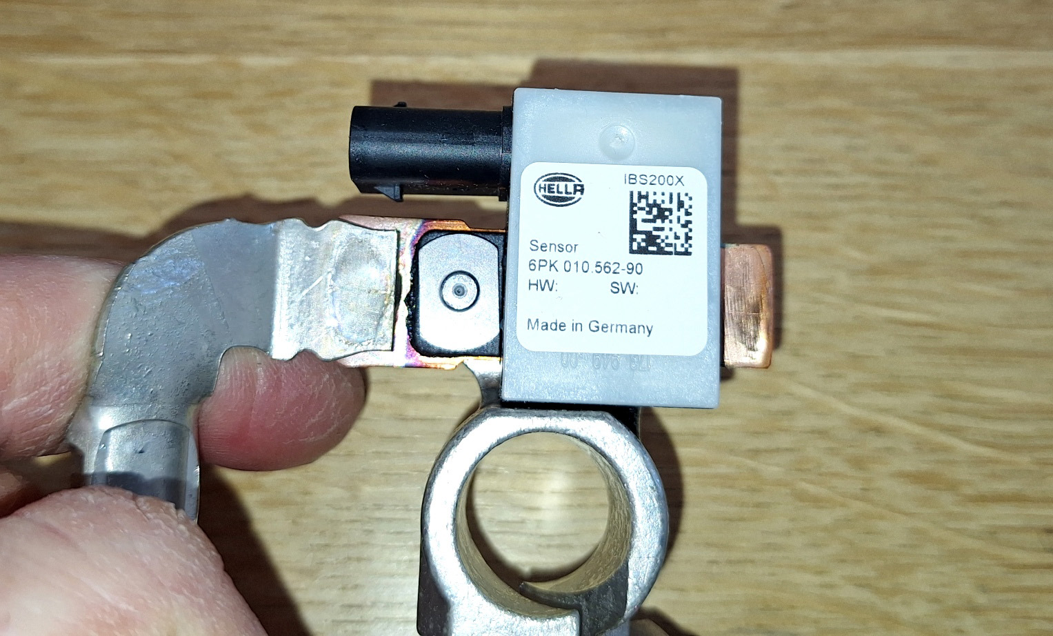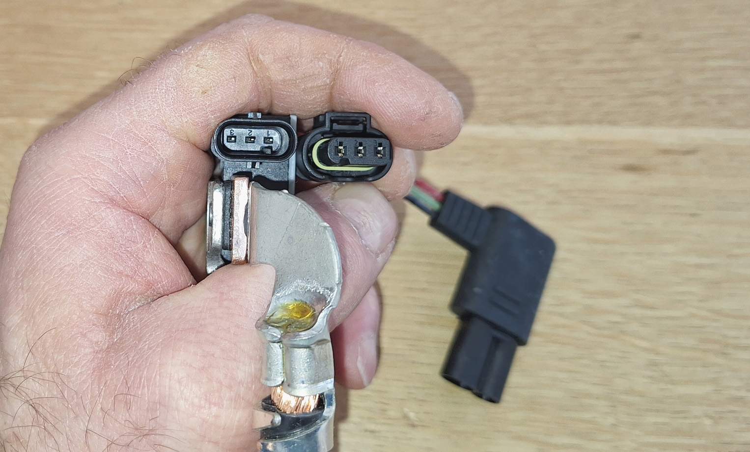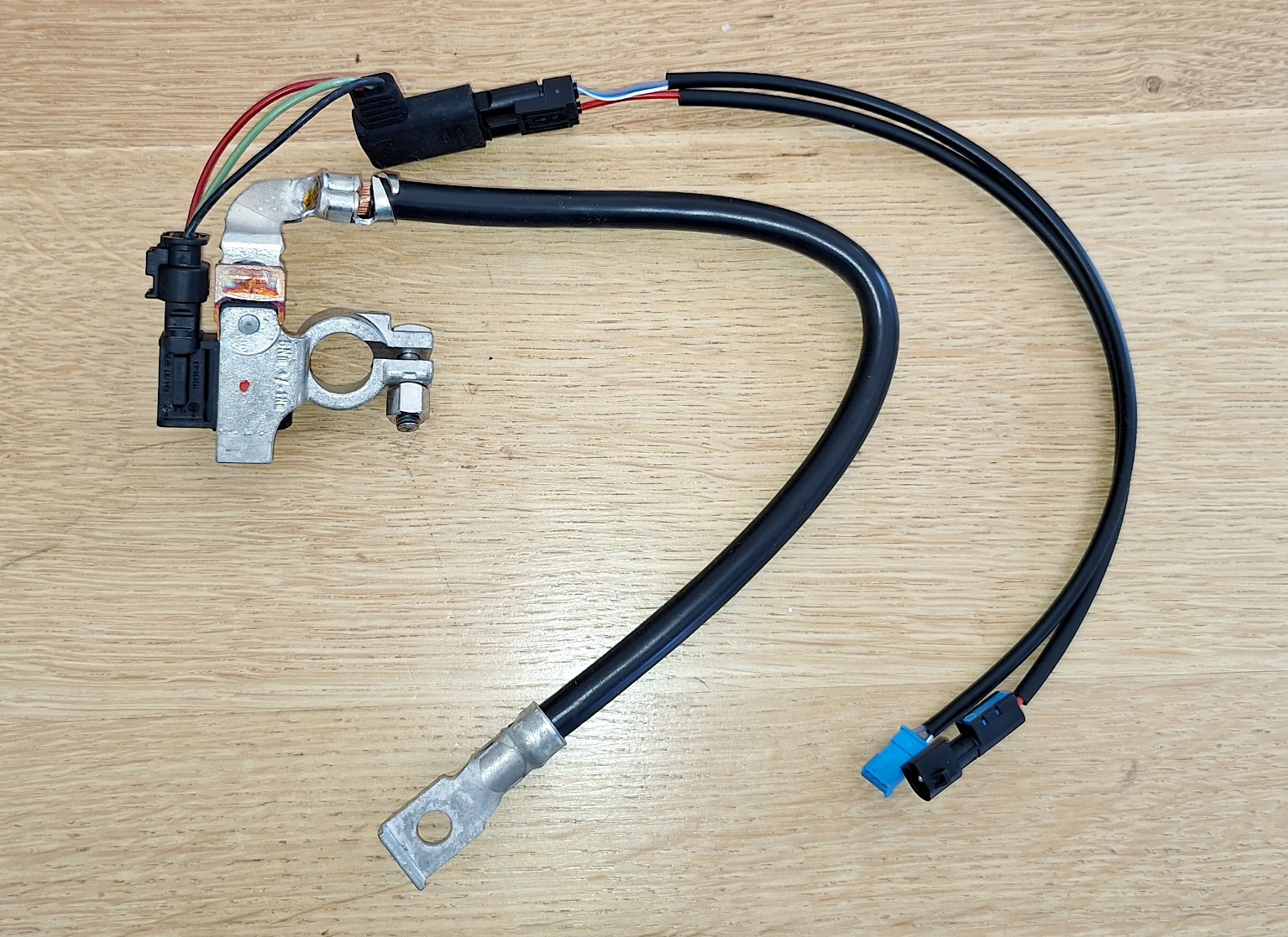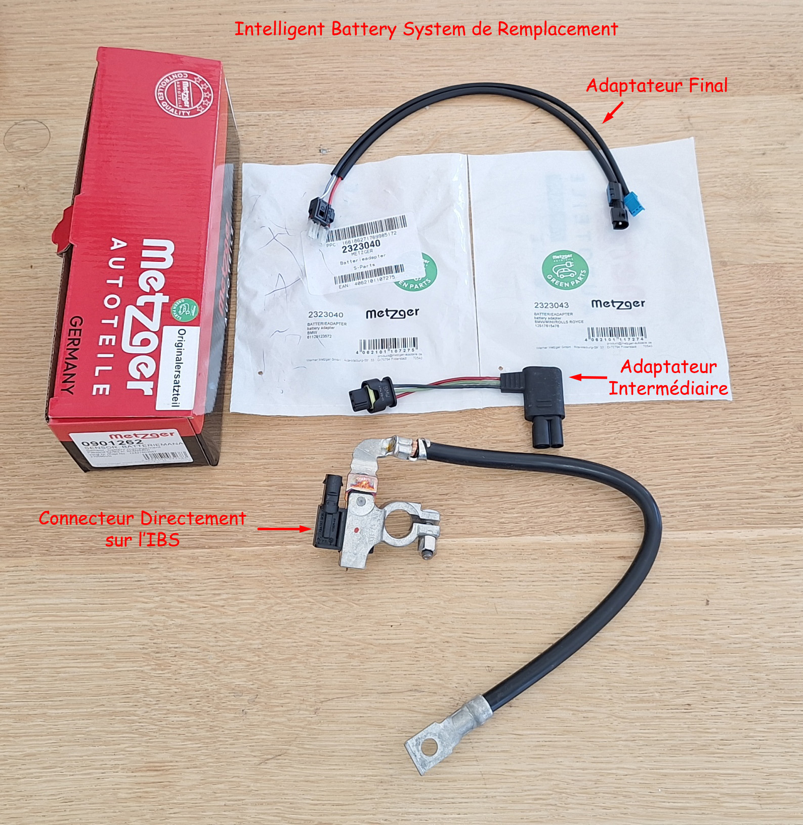 | Nouvel IBS, avec son connecteur, et la cascade d'adaptateurs pour le relier au faisceau électrique d'origine.