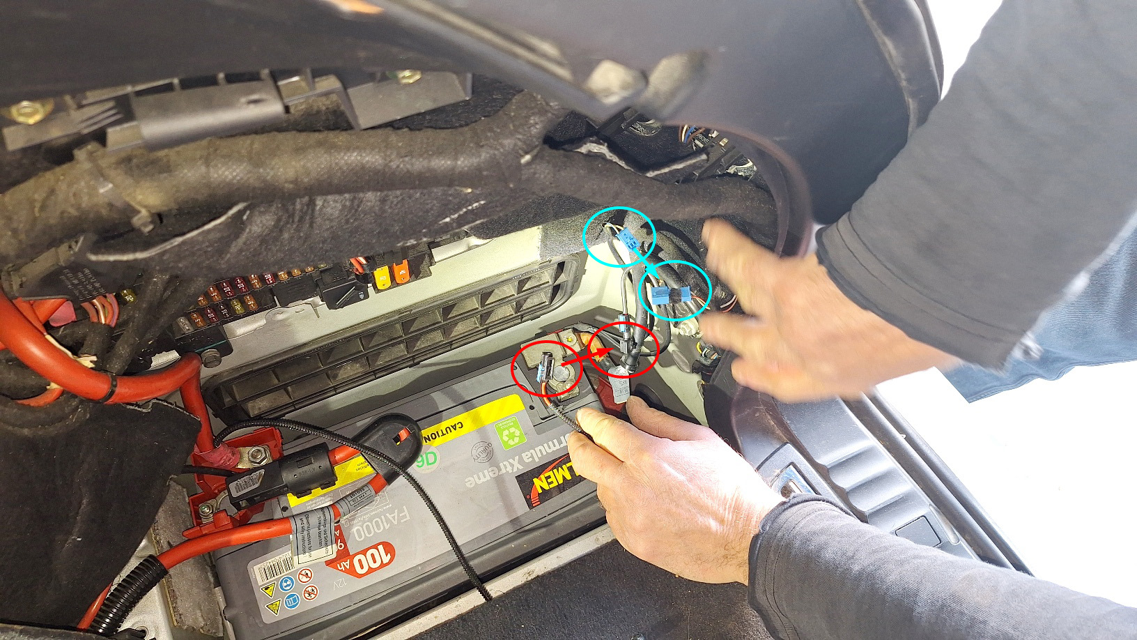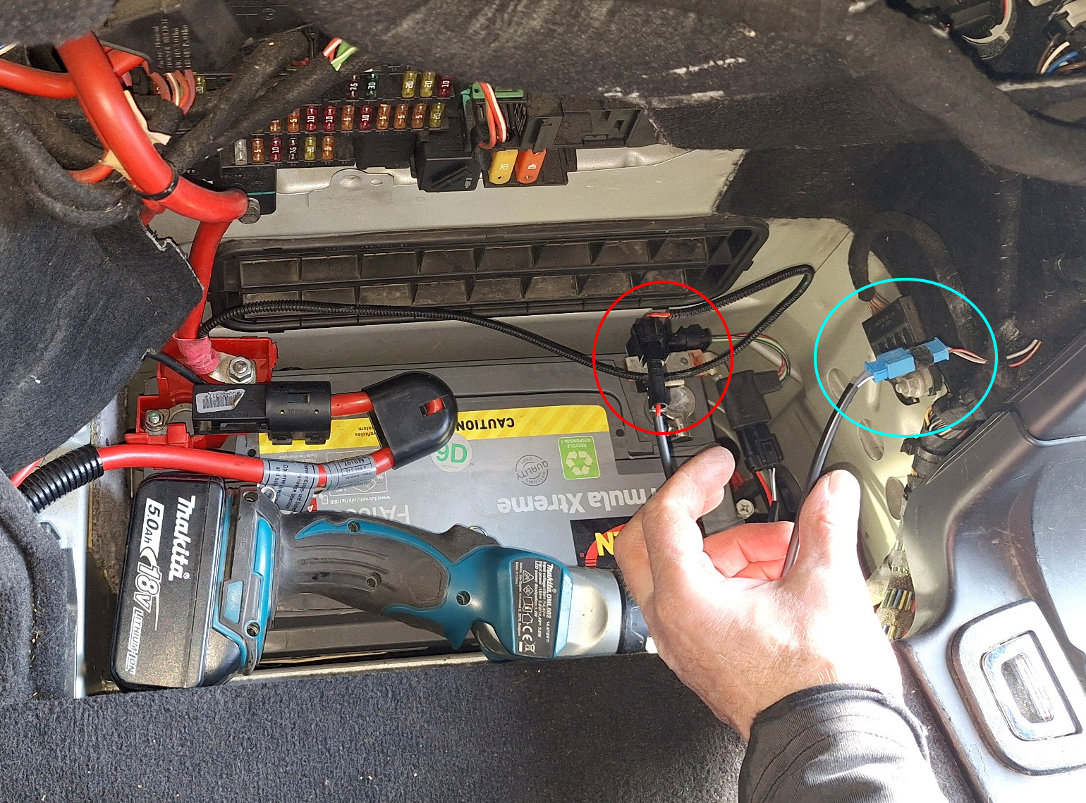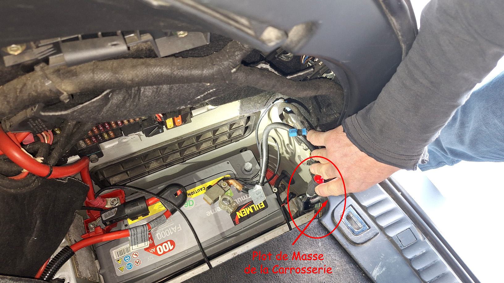 -Connexion sur le plot de masse, puis sur la batterie.