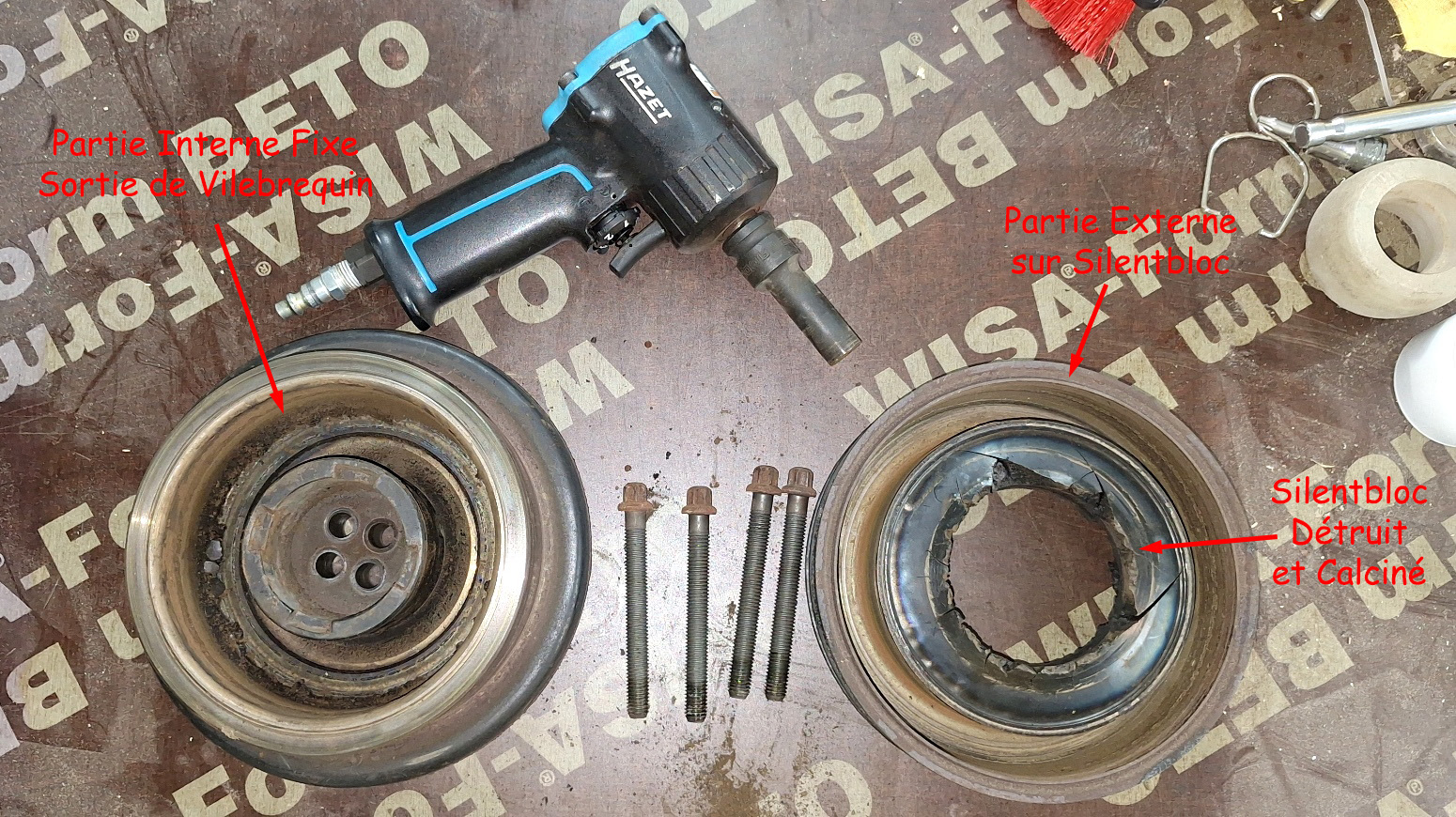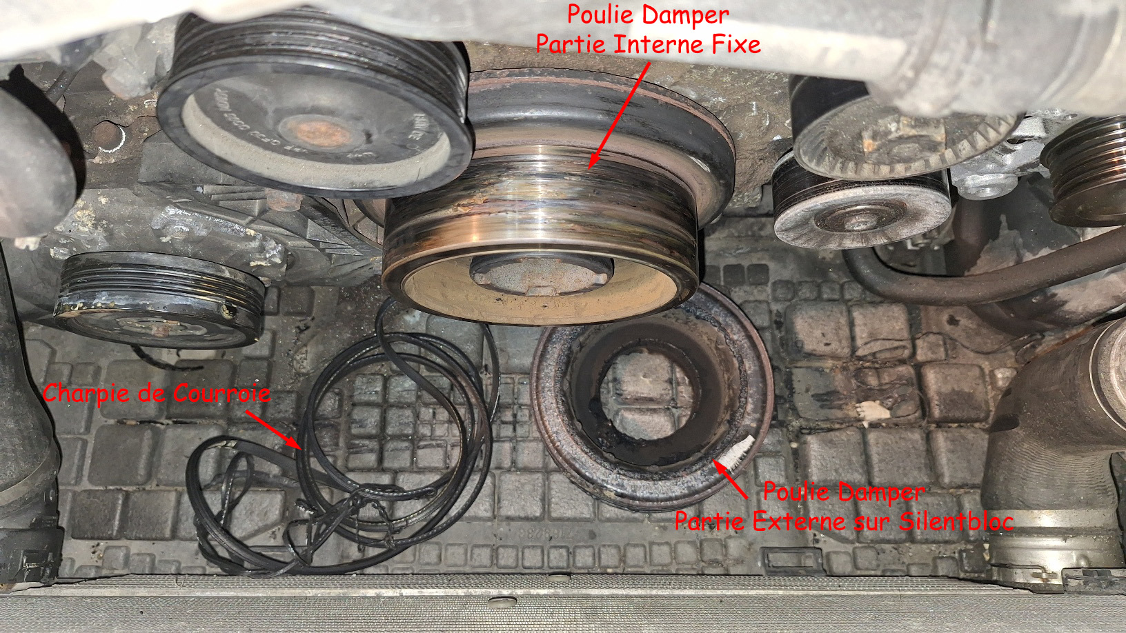 Donc je refais des tests routiers à proximité de la maison, voiture en l'état, pour peaufiner mon diagnostique, un petit tour de 20 minutes. De retour, devant le garage, plus de direction, plus de charge batterie, je lève le capot... courroie à nouveau coupée, et la poulie Damper séparée en deux. Je me demande encore comment ce pseudo-garagiste a testé cette poulie, cela devait se résumer à une inspection visuelle !