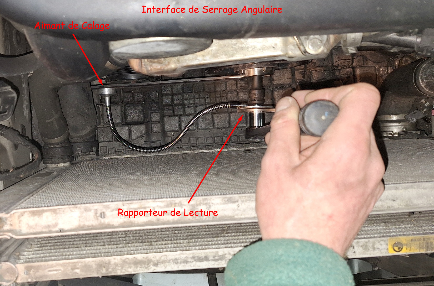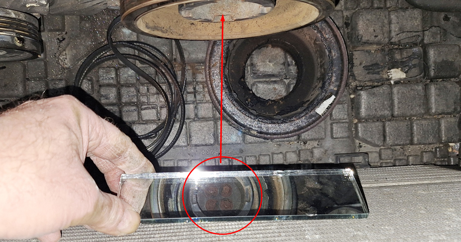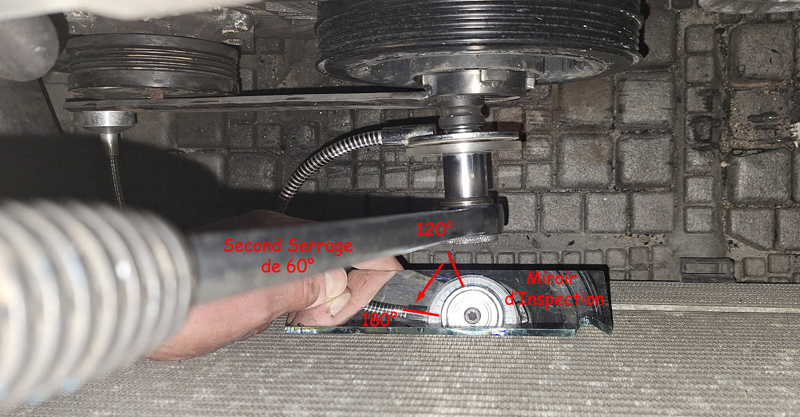 On voit comment visualiser son serrage via un miroir d'inspection... qui sera tenu pas une seconde personne, car j'aurai mes deux mains sur le cliquet pour qu'il travail bien dans l'axe.