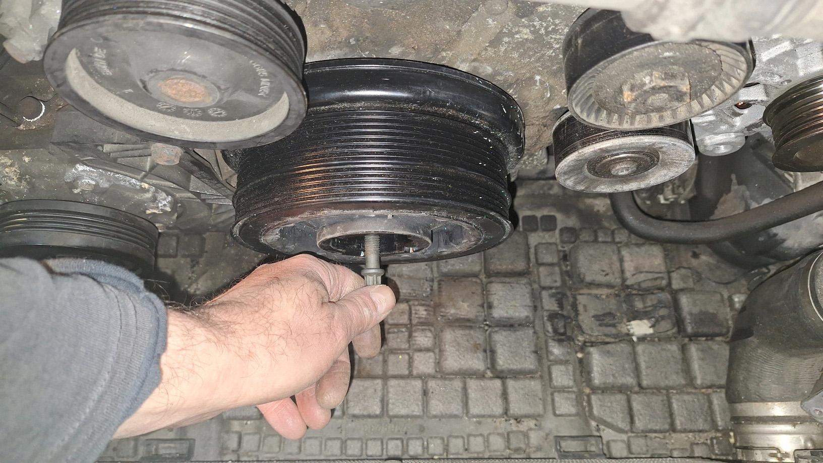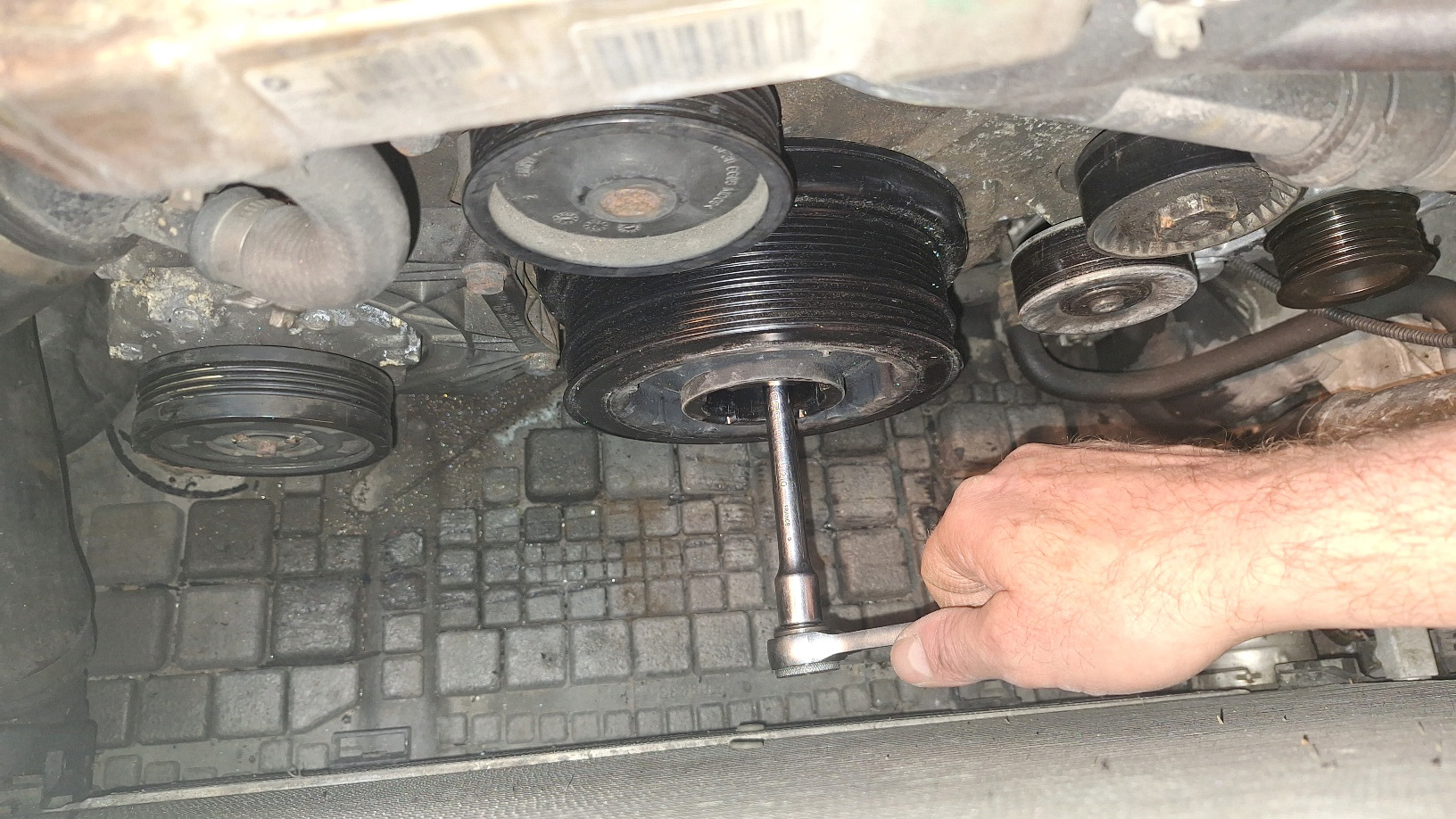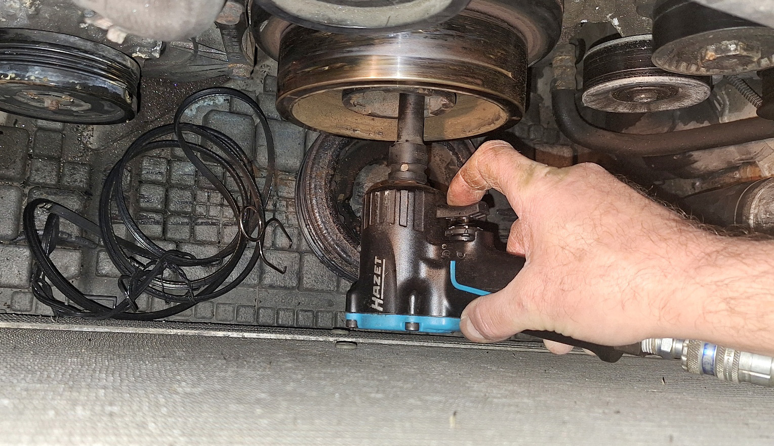 Je ne m'emmerde pas à bloquer cette poulie pour la déposer, ma petite clé à choc pneumatique fera l'affaire.