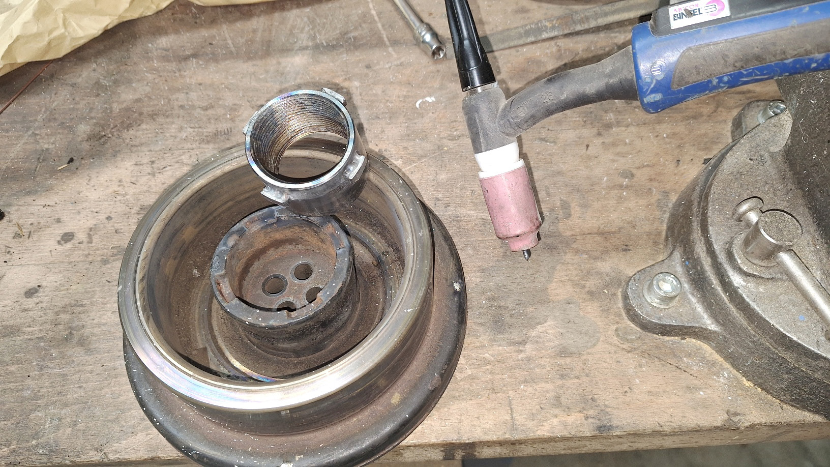 <= L'ancienne poulie me sert de gabarit de soudage.