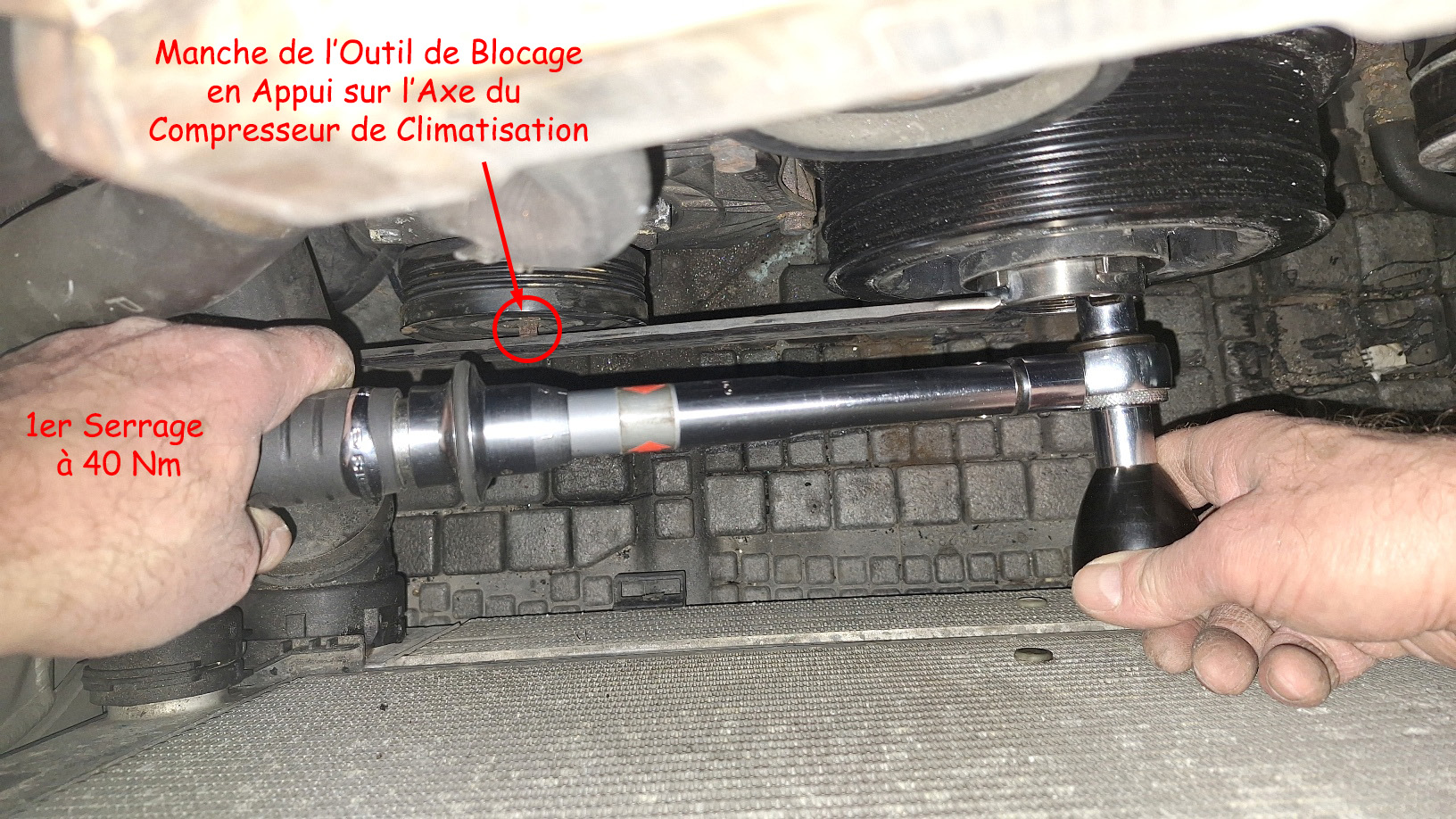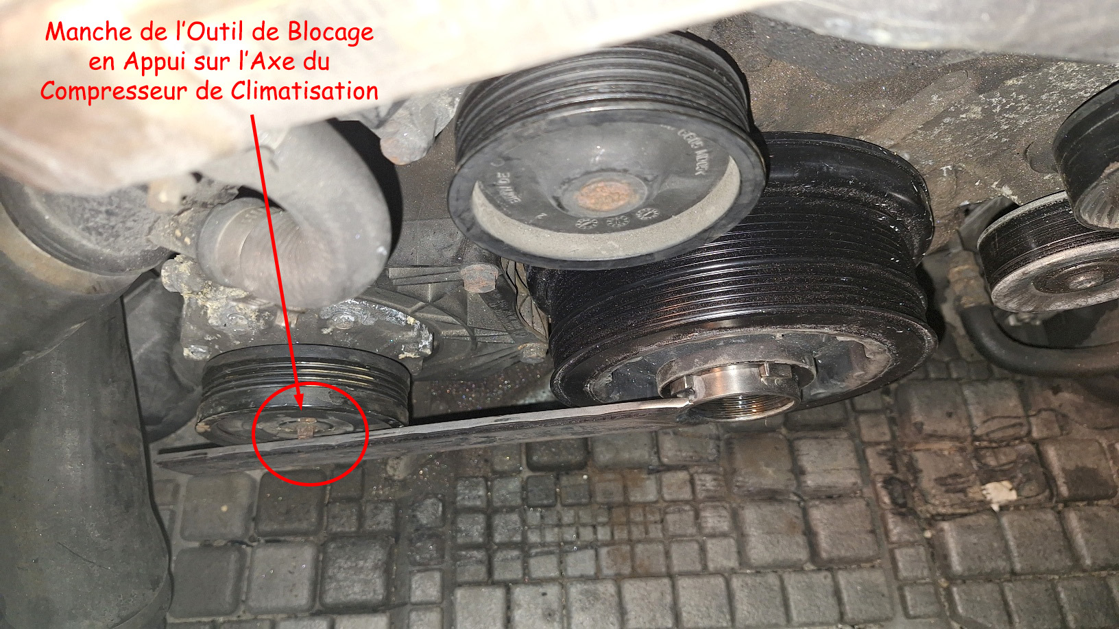 Ici on voit comment sera mis en place l'outils de blocage, qui sera bloqué en rotation par l'axe de la poulie du compresseur de climatisation.