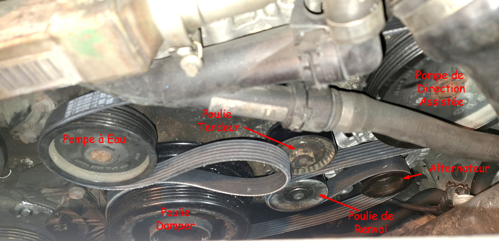 Le petit carnage, la poulie Damper s'est scindée en deux, courroie en charpie... Et un "vrai" mécanicien l'avait contrôlé.